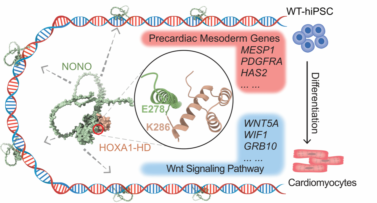 先天性心脏病(congenital heart disease)是由于胚胎时期心血管发育异常所引起的一类心血管畸形,位居我国出生缺陷首位,疾病负担沉重且发病机制复杂。心脏发育依赖于基因表达的精确时空调控,其核心由心脏转录调控网络驱动,并分别在早期谱系分化与后期心肌成熟阶段发挥关键作用。NONO(non-POU octamer-binding protein)是一种核内调控蛋白,参与转录调控与可变剪接,并作为细胞旁斑(paraspeckles)的重要组成成分。NONO 可通过螺旋-翻转-螺旋结构域及RNA识别基序,同时结合DNA与 RNA,从而介导 mRNA 剪接、转录调控及DNA双链断裂修复等过程。在小鼠胚胎干细胞中,NONO 通过调控多能性相关基因表达维持细胞状态,其缺失会扰动自我更新与分化平衡并导致神经分化异常。临床研究显示,NONO的功能丧失突变与多种先天性心脏病及心肌病相关,包括室间隔缺损、肺动脉狭窄、右位主动脉弓、Ebstein畸形以及左心室致密化不全等。然而,NONO在心脏发育与心肌细胞分化中的具体作用及其分子机制仍有待阐明。