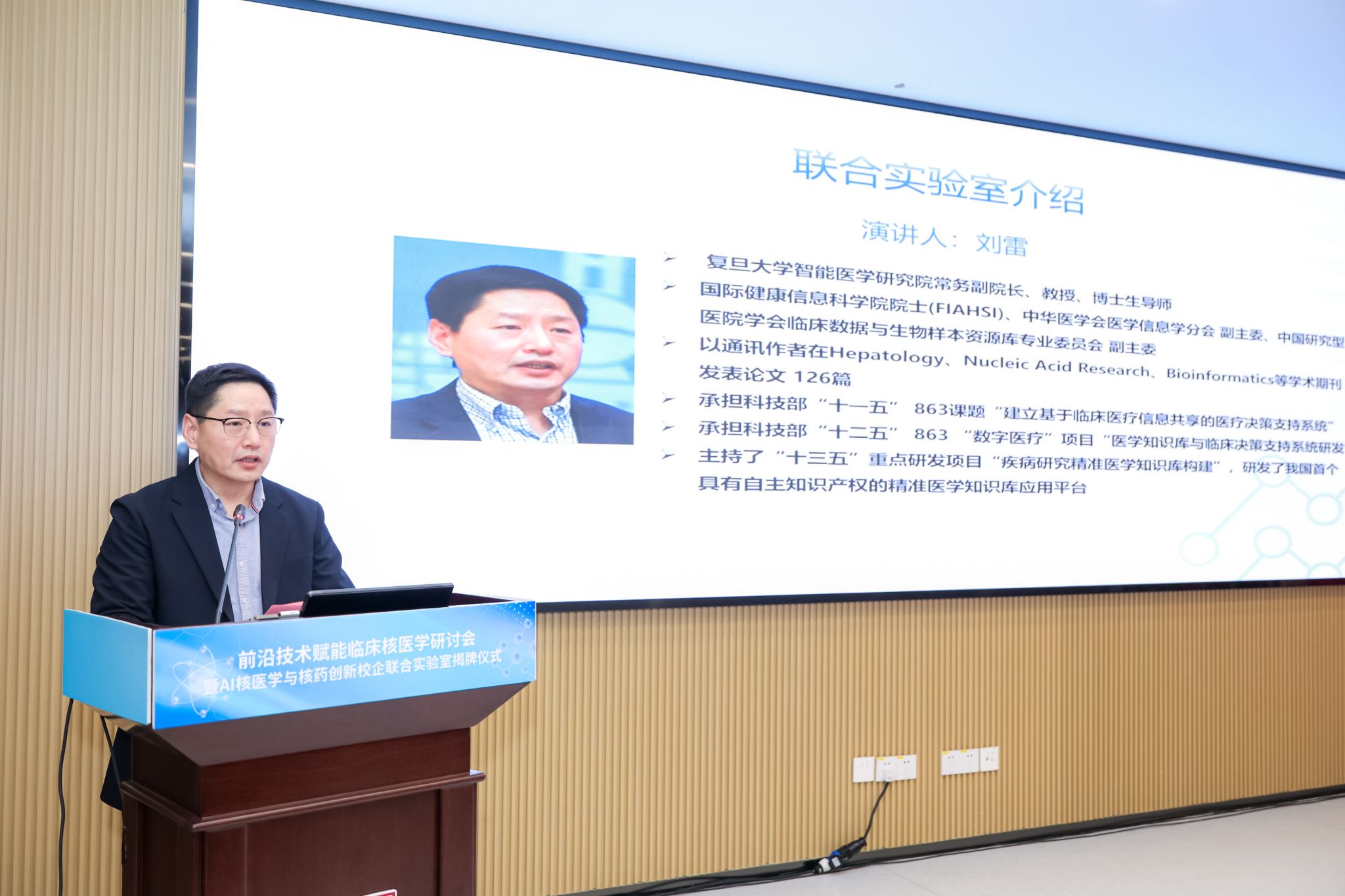 复旦大学智能医学研究院常务副院长 刘雷教授代表 “AI核医学与核药创新校企联合实验室”的共同主任,系统介绍了实验室的建设背景、总体定位与重点方向。他指出,实验室面向国家核医学高质量发展与基层能力提升的现实需求,依托复旦大学在智能医学与医工交叉领域的科研优势,联合产业力量,探索以人工智能驱动核医学与核药协同创新的新模式。他强调,联合实验室将围绕核医学诊疗全流程智能化和核药研发模式创新,贯通“技术研发—成果转化—临床与基层应用”全链条,推动前沿技术真正服务临床实践与基层医疗。实验室的成立,是深化校企协同、推动医工融合、服务国家战略的重要实践,旨在为我国核医学事业的高质量发展提供可复制、可推广的创新范式。