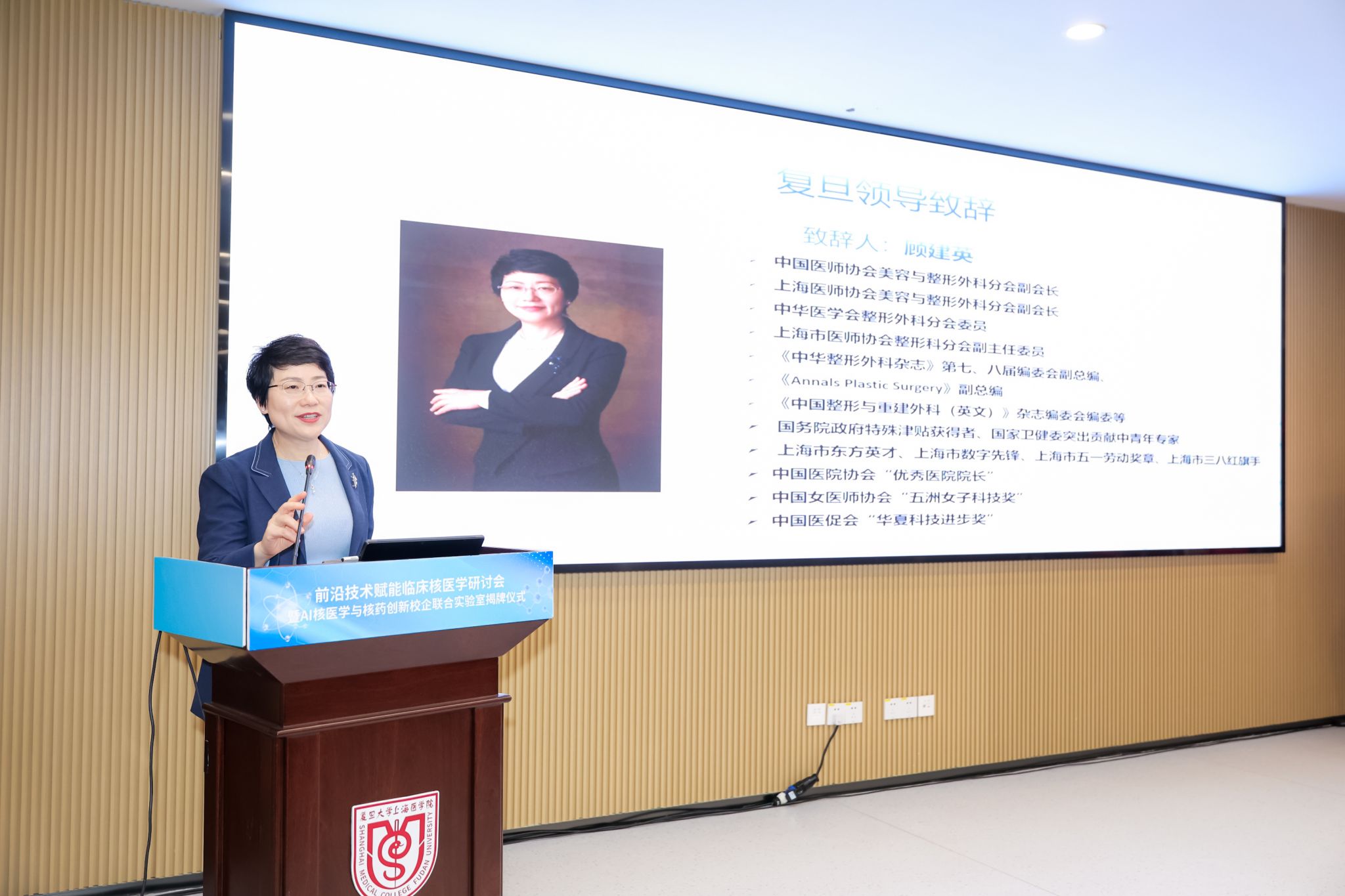 复旦大学附属中山医院党委书记、复旦大学智能医学研究院副院长 顾建英教授致开幕辞。她代表复旦大学智能研究院、复旦大学附属中山医院、国家AI人工智能中试基地,向本次活动的成功举办表示热烈的祝贺!她表示,AI 核医学与核药创新校企联合实验室的成立是以AI赋能核医学创新、推动医工交叉、产学研用深度融合的重要举措。她期望通过整合优势资源、深化开放合作,全力推进实验室建设,推动前沿科技成果高质量转化,努力将其打造成为具有国际影响力的创新策源地和成果转化平台。
